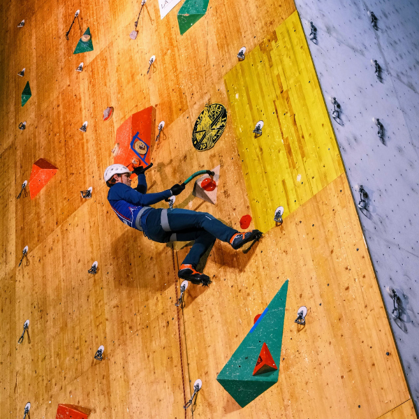 Na wat wachten in de isolatie lezen we de route samen in. De dames en heren klimmen dezelfde route, maar de vrouwen krijgen meer klimtijd en kunnen vijf extra grepen gebruiken. Door de grote hoeveelheid finalisten bij de heren wordt de beschikbare tijd voor hen geknepen. Je moet dus snel klimmen! Na het inlezen van de route moeten we weer terug naar de isolatie. Daar even goed opletten wie er weggeroepen werd en wanneer je moet starten met opwarmen. Met verschillende mensen bespreek ik de route en grepen en ik gooi een balletje over met wat Slovenen. Annick klimt eerder dan ik waardoor ik haar beklimming niet kan zien. Gelukkig hebben ze een uitstekende livestream wat later kijken ook mogelijk maakt. Annick klimt sterk en komt hoog in de route. Helaas raakt haar tijd op en moet ze stoppen, time-out. Mijn poging gaat naar wens, mijn doel is het maken van de sprong die in de herenroute zit. Ik ben kalm als ik begin, ik let op een rustige ademhaling en kom goed in de route met een helder hoofd. Annick roept de tijd en ik begin te versnellen, ik wil nog de sprong halen. Daar aangekomen hoor ik: “Tom, nog 30 seconden!”. Ik heb van tevoren bedacht hoe ik de sprong wil maken maar daar aangekomen ben ik er niet zo zeker meer over. Waar laat ik nou mijn andere bijl, op mijn schouder, in mijn hand, in mijn mond? Het is druk ik mijn hoofd en er is geen tijd. Haal ik überhaupt nog adem? Ik doe een testpoging en daarna ga ik ervoor. Tijdens de afzet schiet mijn voet weg en tuimel ik naar beneden. Adem. Oké, doel gehaald, sprong geprobeerd. Glimlach, zwaai. Omhelsd door mijn vrouw.