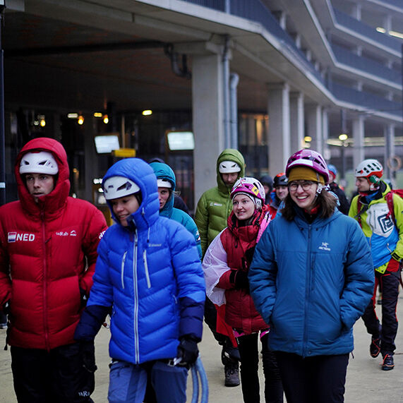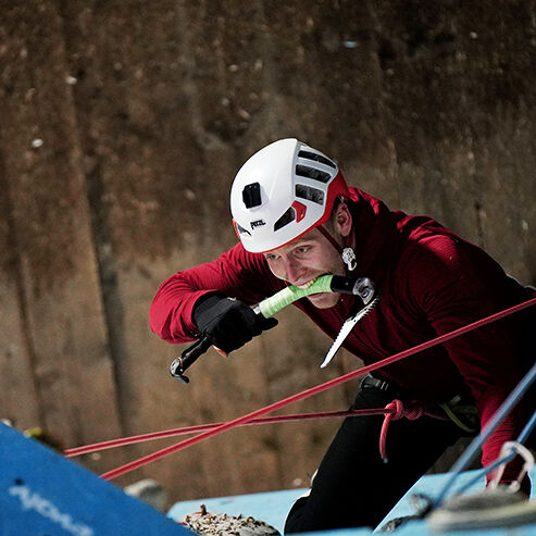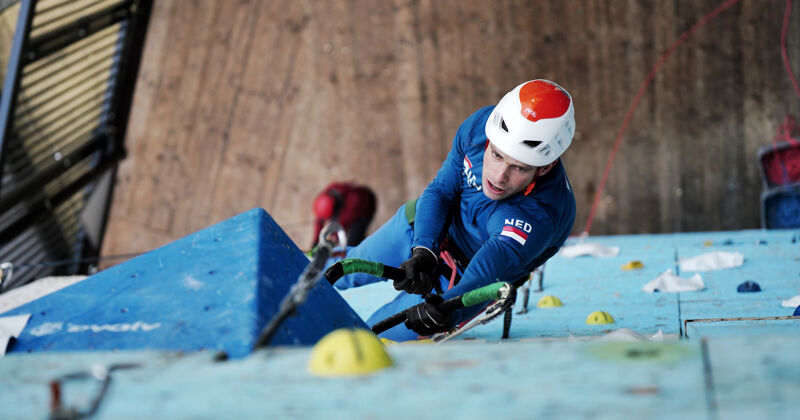 In een land waar je geen bergen en verticaal ijs vindt, is ijsklimmen en drytoolen een niche-sport. Toch staan er maar liefst zestien heren en negen dames aan de start bij de klimmuur Kalymnos van Sportcentrum Olympos. IJsklimwedstrijden worden gehouden op een drytoolwand. Deze is technisch moeilijker te maken dan ijs en een grote plus is dat de route op deze manier nooit dooit. Maar als het weer het toelaat worden er echte ijselementen toegevoegd. Wat vandaag het geval is.