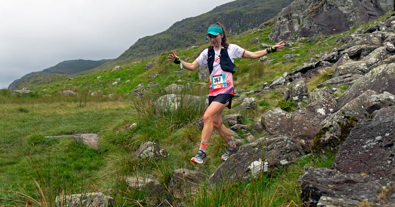 Overall winnaar bij de SkyUltra dames race, Holly Wootten laat zien hoe je afdaalt in technisch loopterrein.