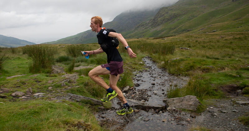 Daan Nieuwenhuis tankt bij op Kirkstone Pass voor het laatste deel van de SkyUltra race.