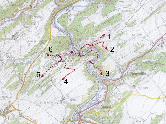 | 4-6 | Richting Verlaine | Vanuit de HerBerg linksaf, voor spoor naar rechts; -- via voetgangersbrug over spoor de Ourthe oversteken; -- stroomafwaarts Ourthe volgen over weg richting Verlaine; -- dan naar N831, naar Tohogne of naar N806 (via Herbet). |