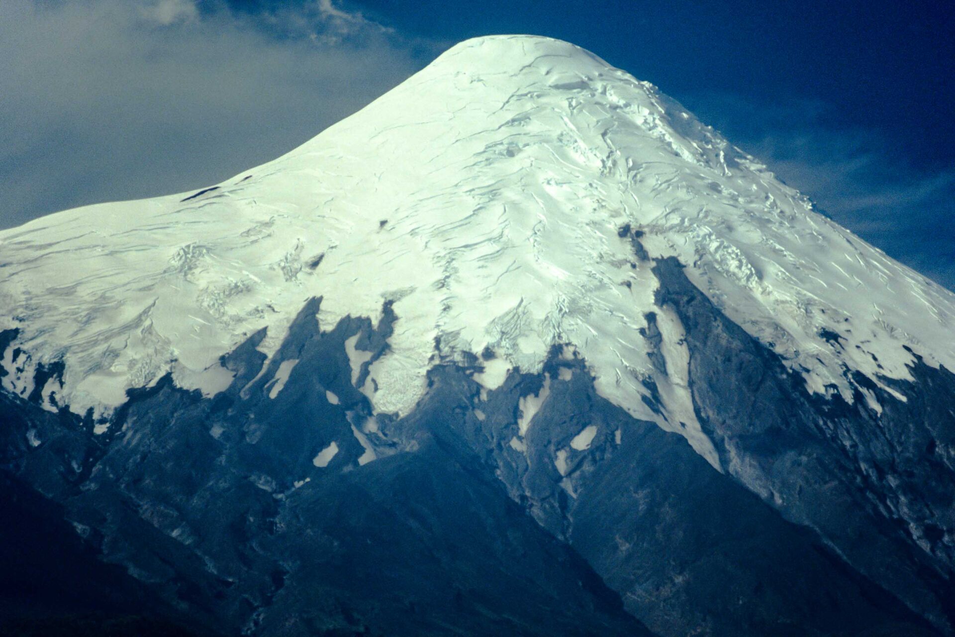 Robert Eckhardt aan de rand van een gletsjerspleet vlak onder de top van de Volcán Osorno (2661m). De laatste uitbarsting van de vulkaan was in 1869. De top is nog steeds warm, dat het betreden ervan – vanwege instabiel ijs – een hachelijke zaak kan zijn.
