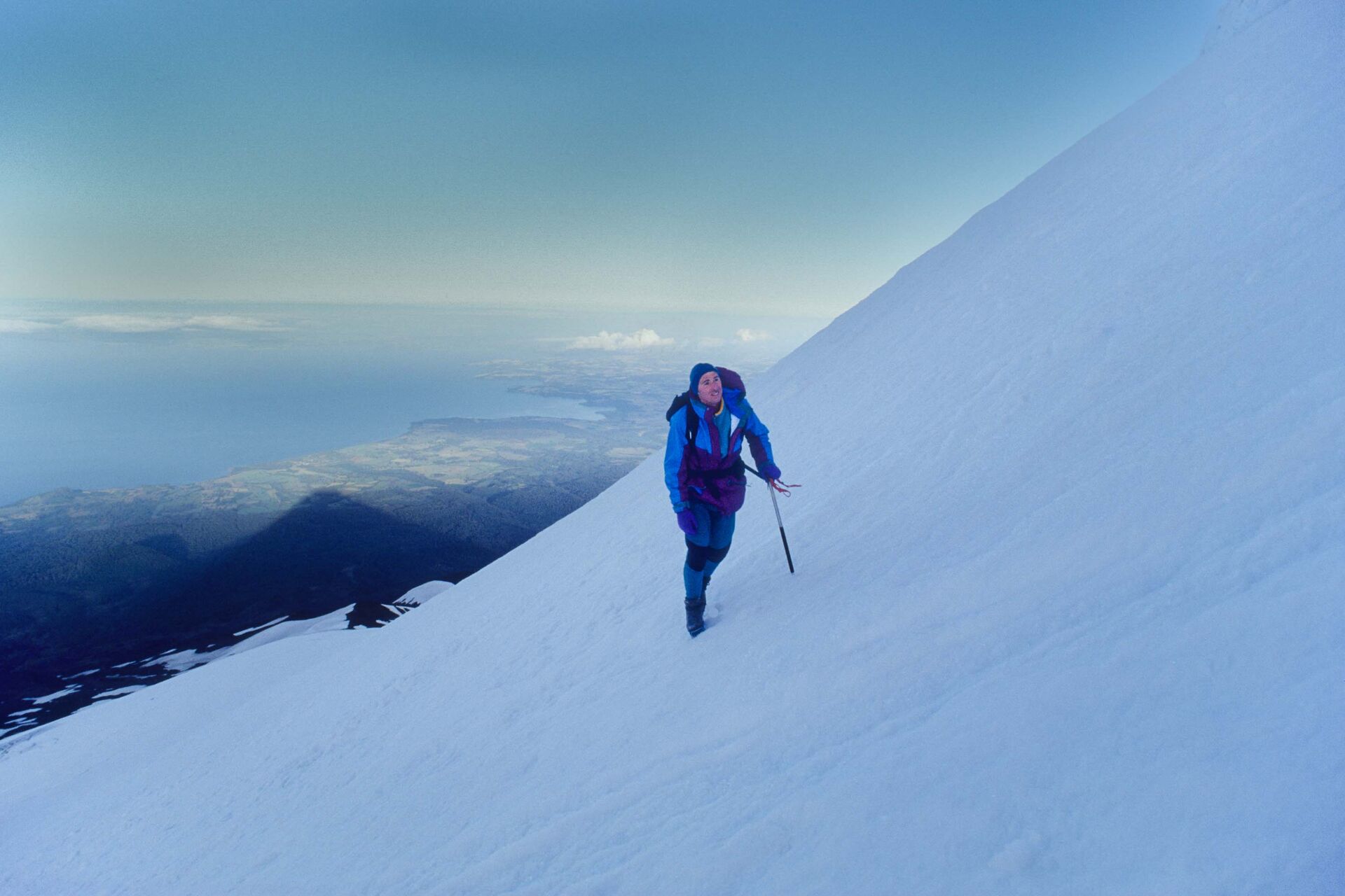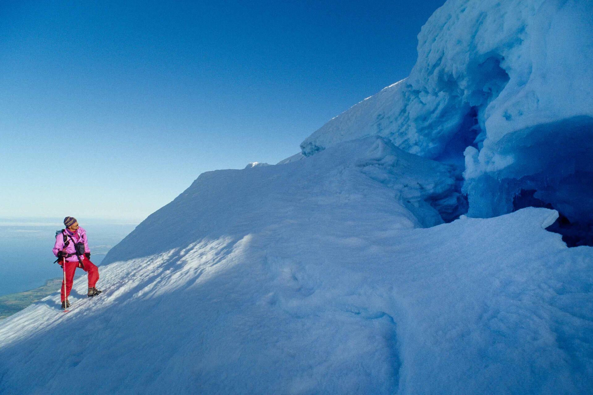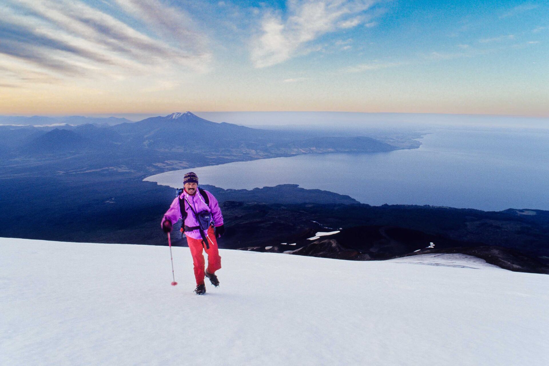 Peter Brils aan de rand van een gletsjerspleet vlak onder de top van de Volcán Osorno (2661m). De laatste uitbarsting van de vulkaan was in 1869. De top is nog zo warm, dat het betreden ervan – vanwege instabiel ijs – een hachelijke zaak kan zijn.