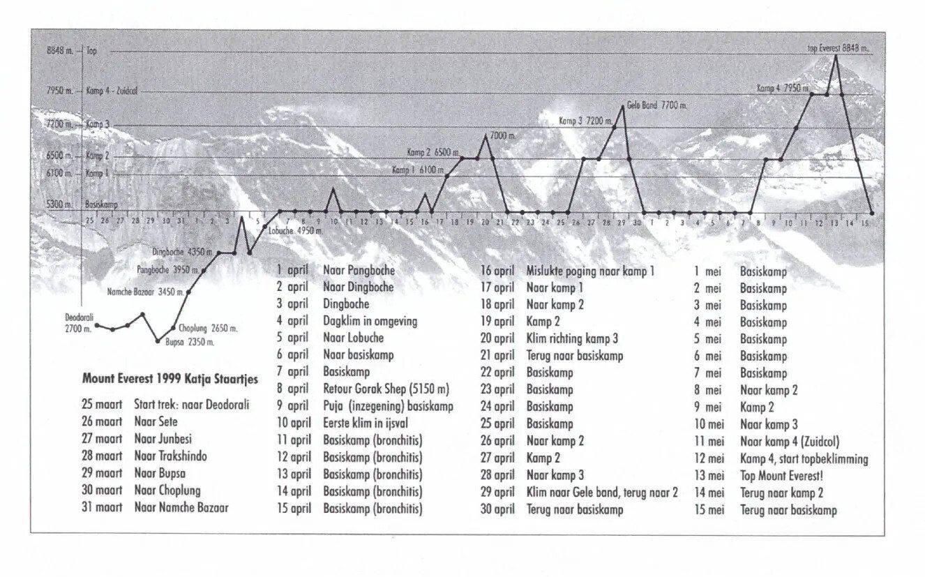 Uiteindelijk bereikten 13 klimmers uit het team (8 westerlingen en 5 Sherpa’s) de top van Mount Everest. Op 13 mei 1999 stond Katja Staartjes als 1e Nederlandse vrouw (en als 4e Nederlander ooit) op de top van de hoogste berg ter wereld. Vanaf 8600m klom zij alleen, ook op de beroemde Hillary-step. Ze gebruikte extra zuurstof vanaf kamp 4 op 7950m, alleen in de klim omhoog, niet in de afdaling.