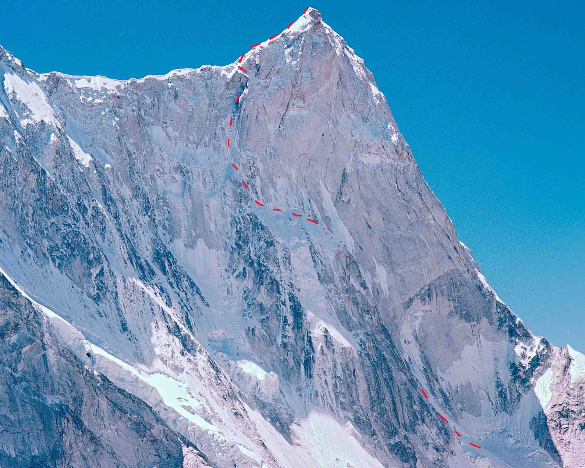 Het aanzicht is inderdaad ‘tamelijk indrukwekkend’. Een granieten plaat rijst 1600 meter hoog voor ons op. Overhangend aan de voet, loodrecht in het midden en overhangend naar de top toe. Maar goed dat wij, naast bergbeklimmen, niet aan basejumpen doen. Nog nooit zag ik zo’n steile Himalayawand. Hoger op de gletsjer staan we alle vier aan het ijs genageld: een vet couloir markeert de overgang tussen de yosemity-achtige granietwand en de met ijs bepleisterde voorbouw. De lijn ziet er fantastisch uit. We hebben onze route gevonden!