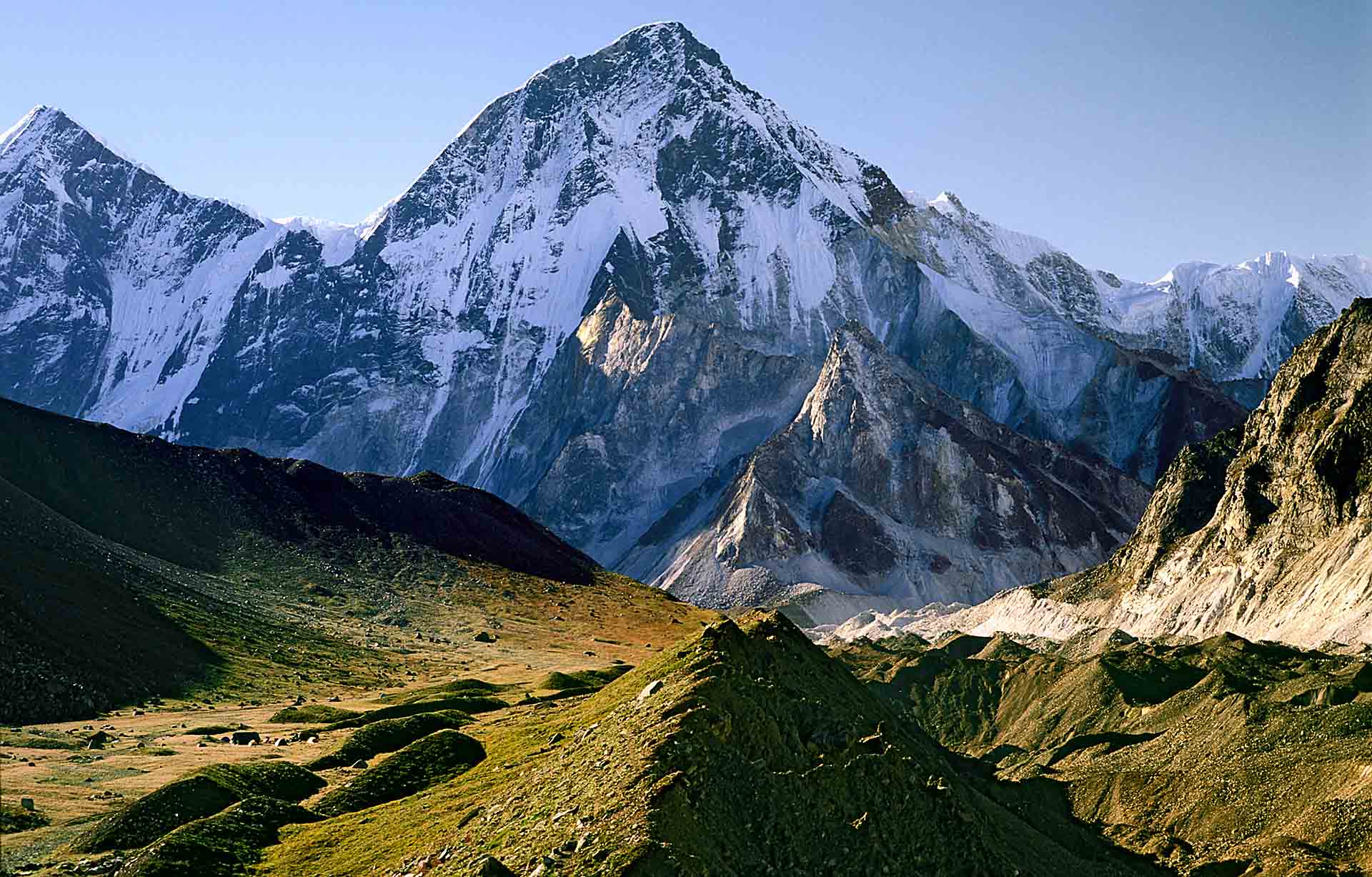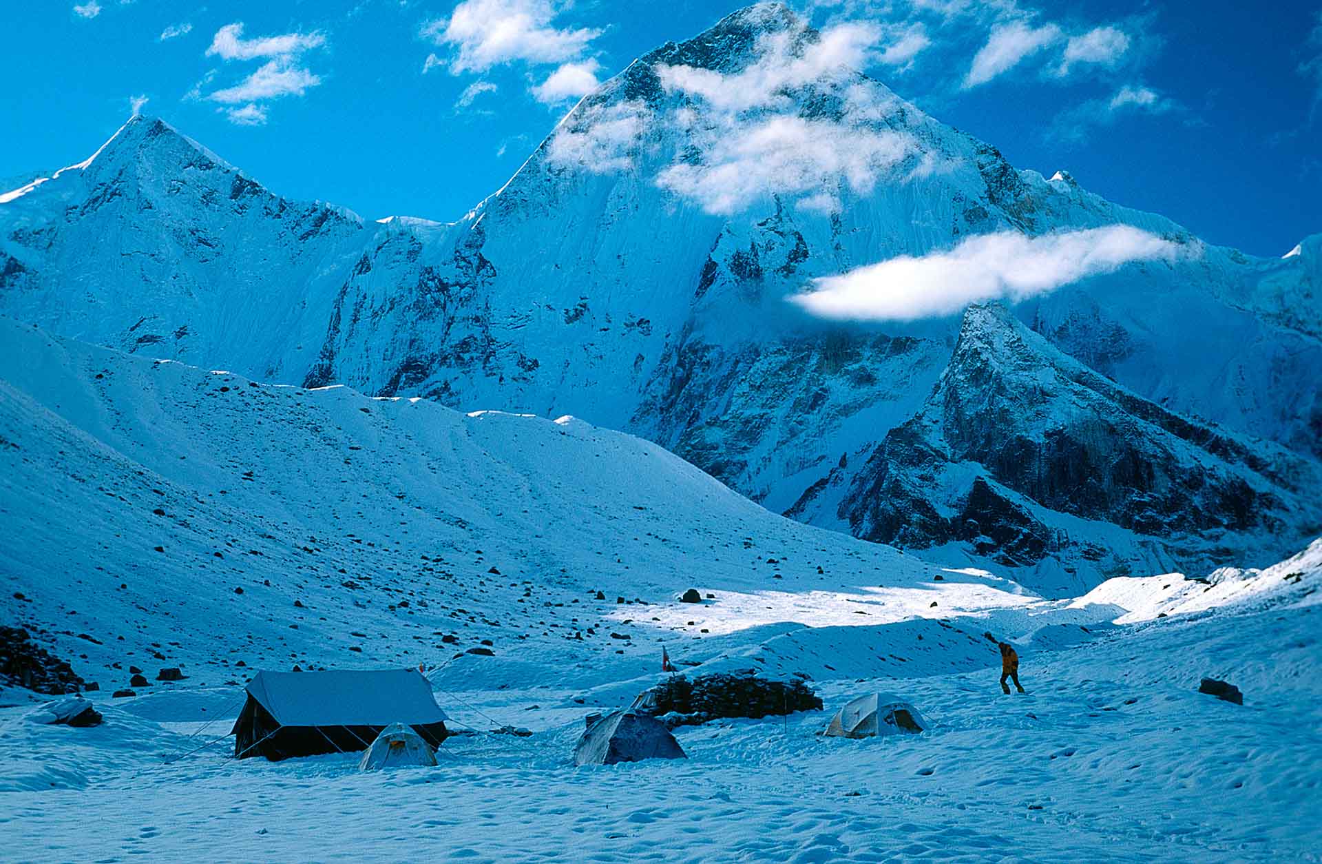We lopen naar de noordwand van de Changabang. Op de gletsjer liggen prachtige steentafels. Mike en ik sjouwen met haulbags van zo’n 35 kilo. Onze beurse schouders vergeten we snel als we onder de wand staan. Eric Shipton noemde Changabang in 1936 'a vertical wall of rock whose smooth face was quite magnificent…' De meest passende omschrijving is van Frank Smythe, die in 1937 een poging deed de 7066 meter hoge Dunaagiri te beklimmen. 'A peak that falls from crest to glacier in a wall that might have been sliced in a single cut of knife.'
