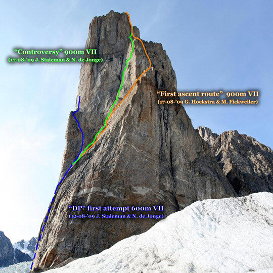 De eerste poging van Niek en Jelle om een directe lijn te openen op Cenotaph mislukte door een sectie met blanke rots. Beide teams deden later een nieuwe poging op de Cenotaph. Gerke en Martin volgden de weg van de minste weerstand en openen de First Ascent Route (900m, VII). Niek en Jelle volgden een meer directe lijn en noemden deze Controversy (900m ,VII). Ze kwamen een uur na Martin en Gerke op de top aan. De gneis bleek niet altijd van goede kwaliteit, waardoor de beklimmingen behoorlijk spannend voelden.
