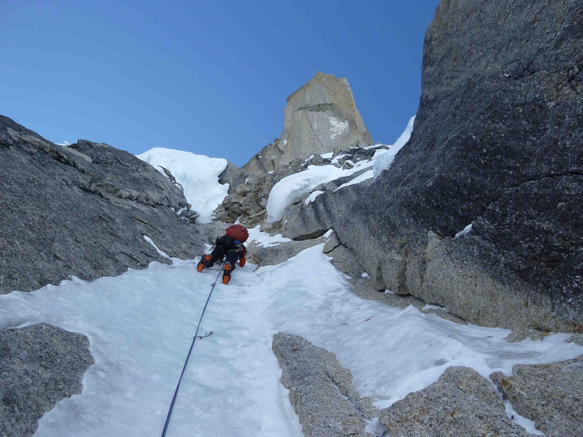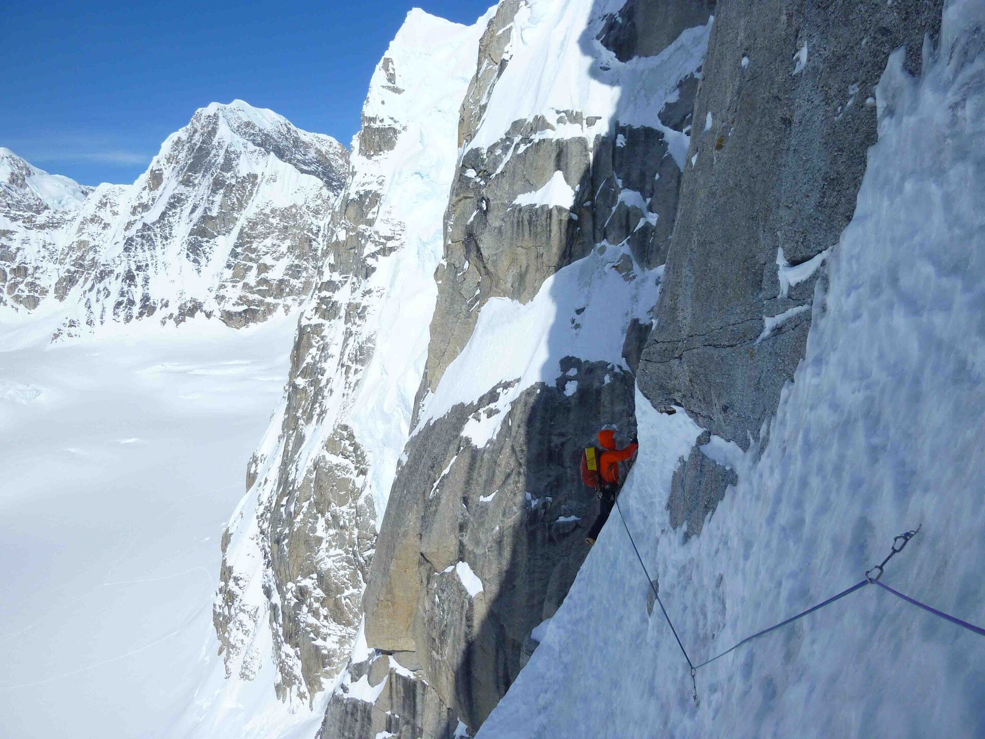 Beklimming Moonflower Buttress (Alaska VI, 5.8 A2, M5, A16) tot het einde van de moeilijkheden, hoofdtop niet bereikt.