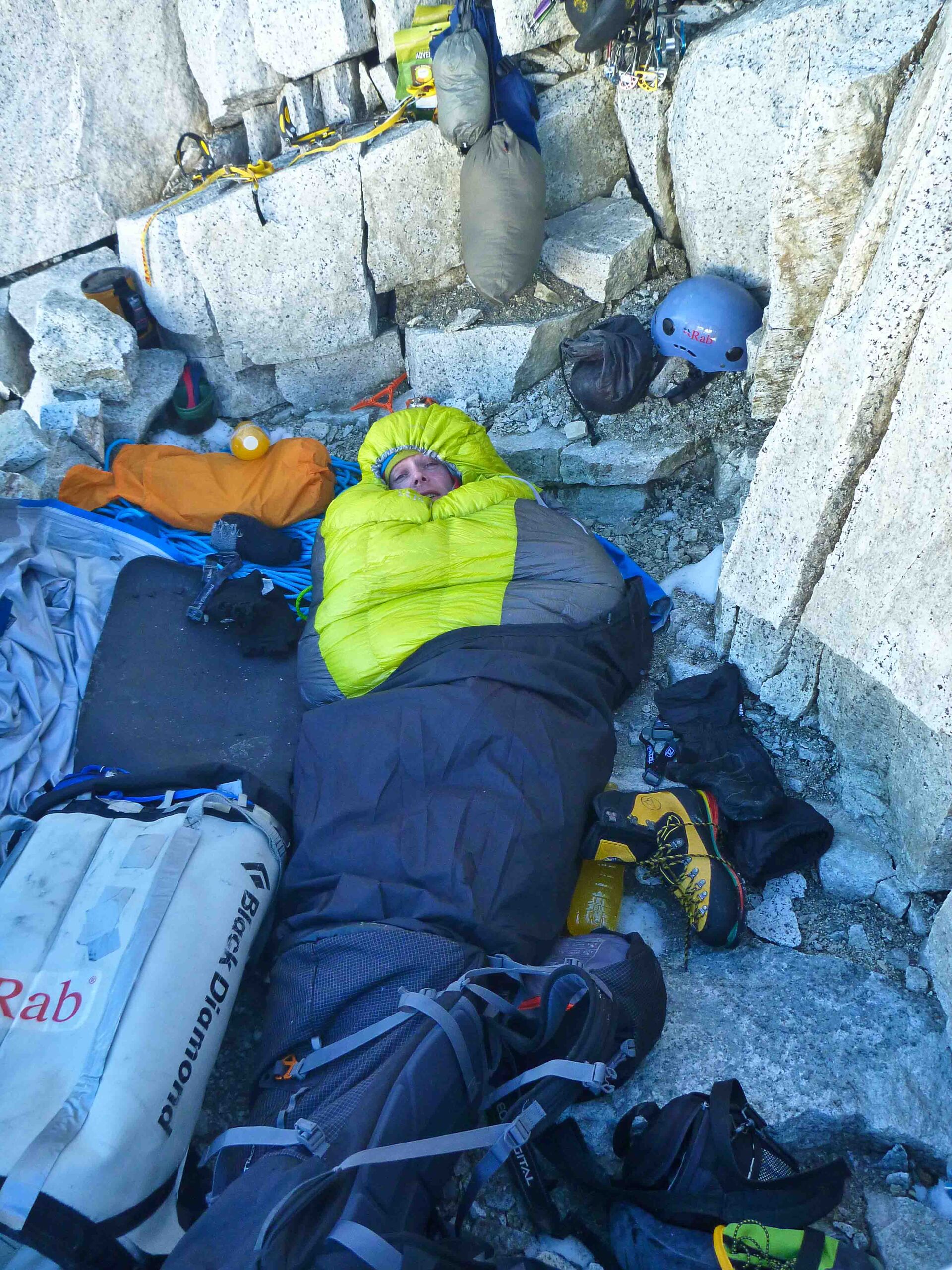 Dat is een goede keuze, want eenmaal in de wand blijken de spleten in de rots vol te zitten met ijs, wat de progressie aanzienlijk vertraagt. Het is een koude dag zonder zon, maar de wind is wel gaan liggen. De hele dag klimmen Niek en Jefta in de wolken, maar het gaat langzaam en het duo besluit besluit een bivak in de wand te maken. De volgende dag is het mooi zonnig weer en een stuk aangenamer klimmen. Gestaag klimt het duo verder omhoog.