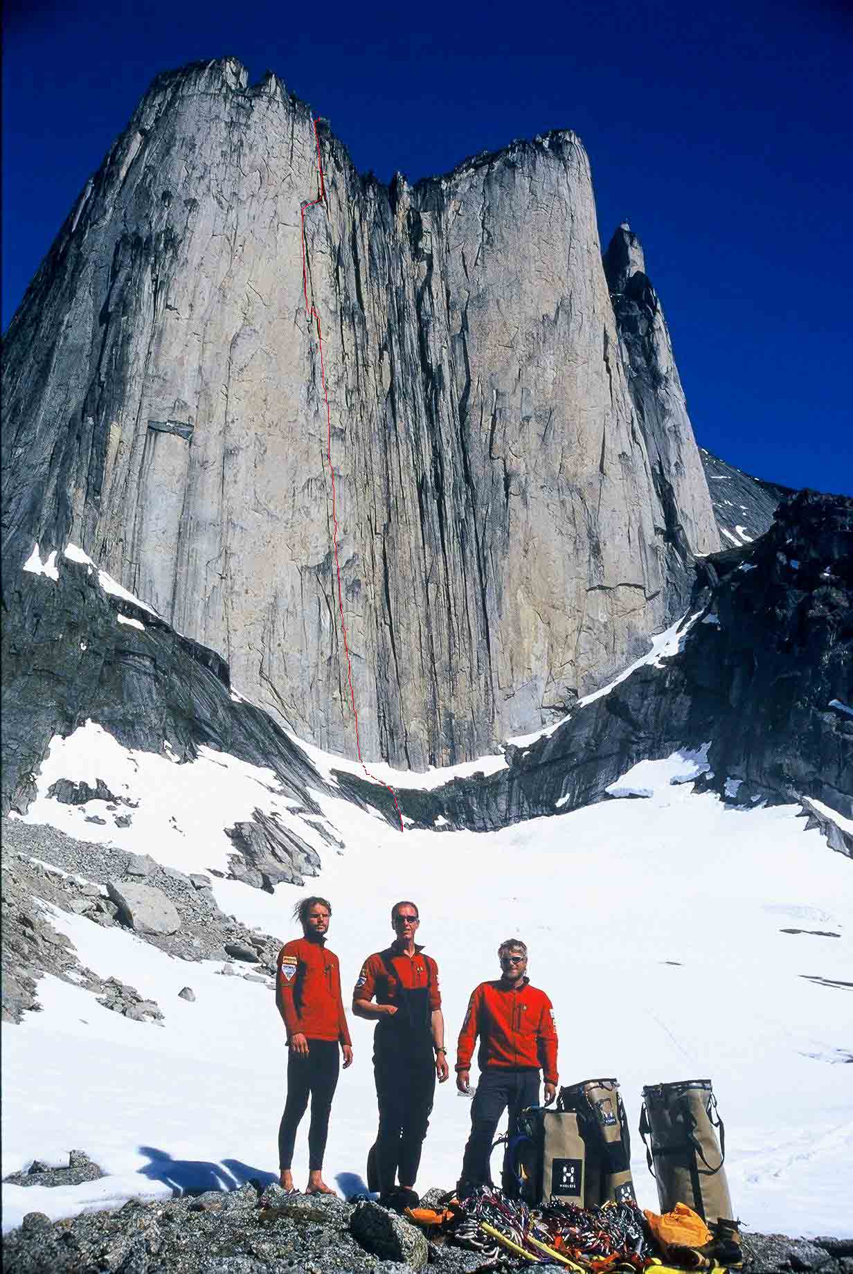 V.l.n.r. Martin, Hans en Ronald met ingetekend de geklommen lijn op de 800 meter hoge westwand van de Nalumasortoq.