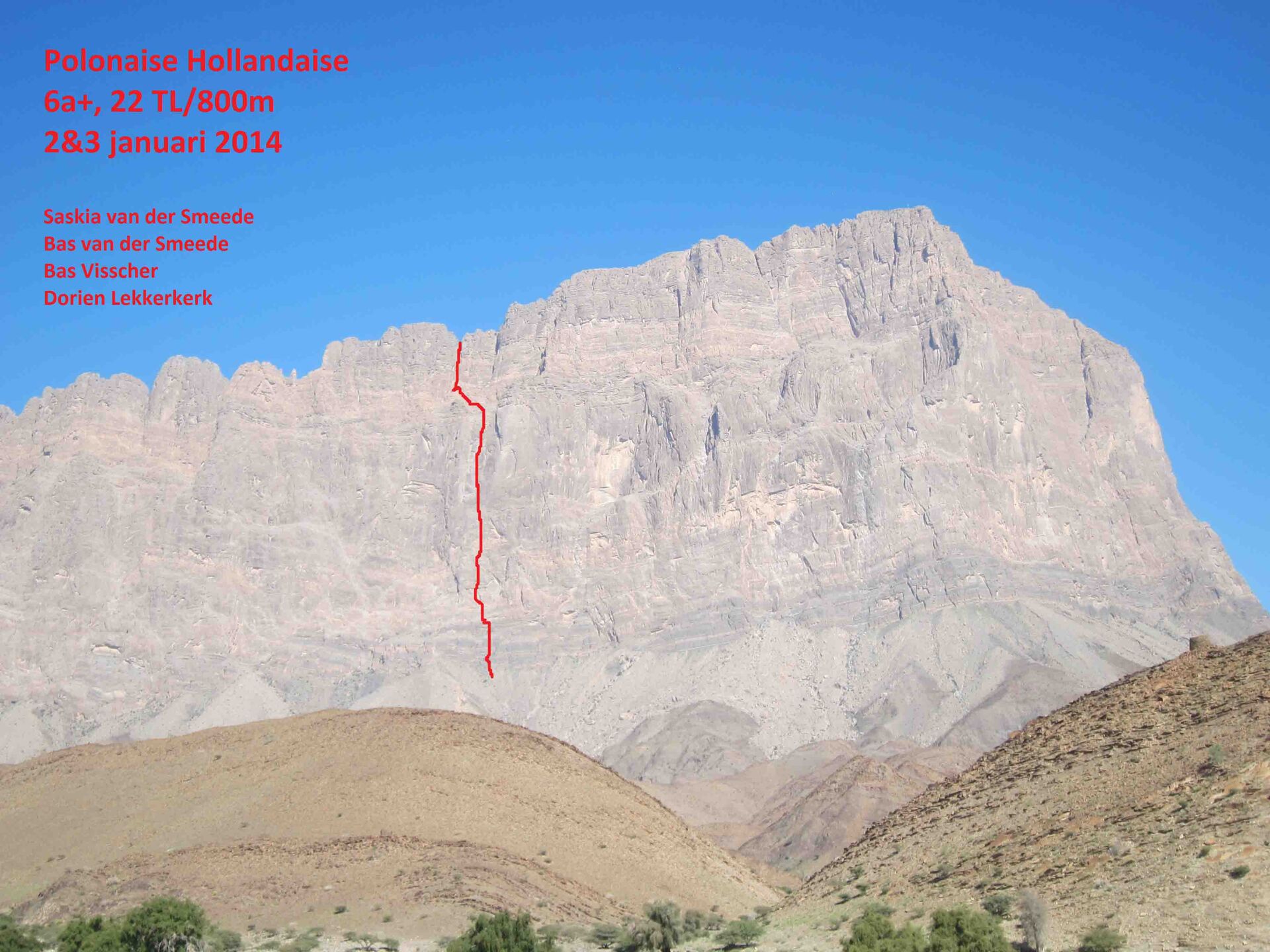 Het viertal deed een beklimming van de Jebel Misht via een mogelijke nieuwe route genaamd Polonaise Hollandaise (800m, 6a+). Ze hadden een bivak in het midden van de wand en een bivak tijdens de afdaling. Niet op hoofdtop geweest. Na contact te hebben gehad met lokale klimmers, blijkt dat de grote hoekversnijding mogelijk al eerder is beklommen. Online is hier geen documentatie over de te vinden. De rotskwaliteit was zeer goed. De maximale moeilijkheidsgraad was ongeveer 6b, de veel lengtes waren tussen de 5b en 6a. Volgens de eerstbeklimmers is de route het waard om te herhalen.