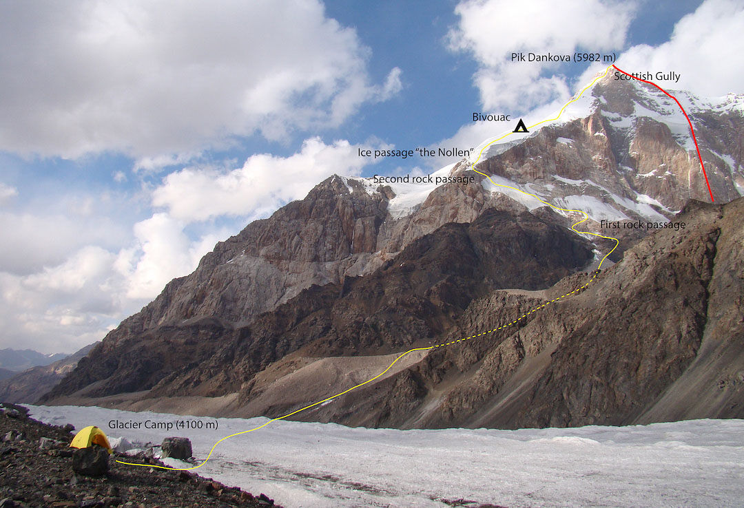 Beklimming van de Peak Dankova via de westgraat (D+). Mogelijk via nieuw terrein. Daarnaast hebben ze twee acclimatisatieroutes gedaan op twee onbeklommen pieken die ze Peak Moker en Peak hebben genoemd.