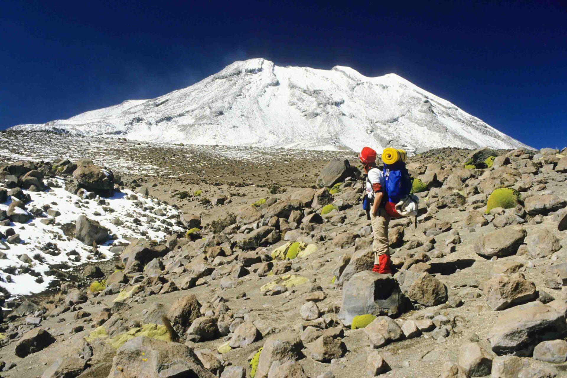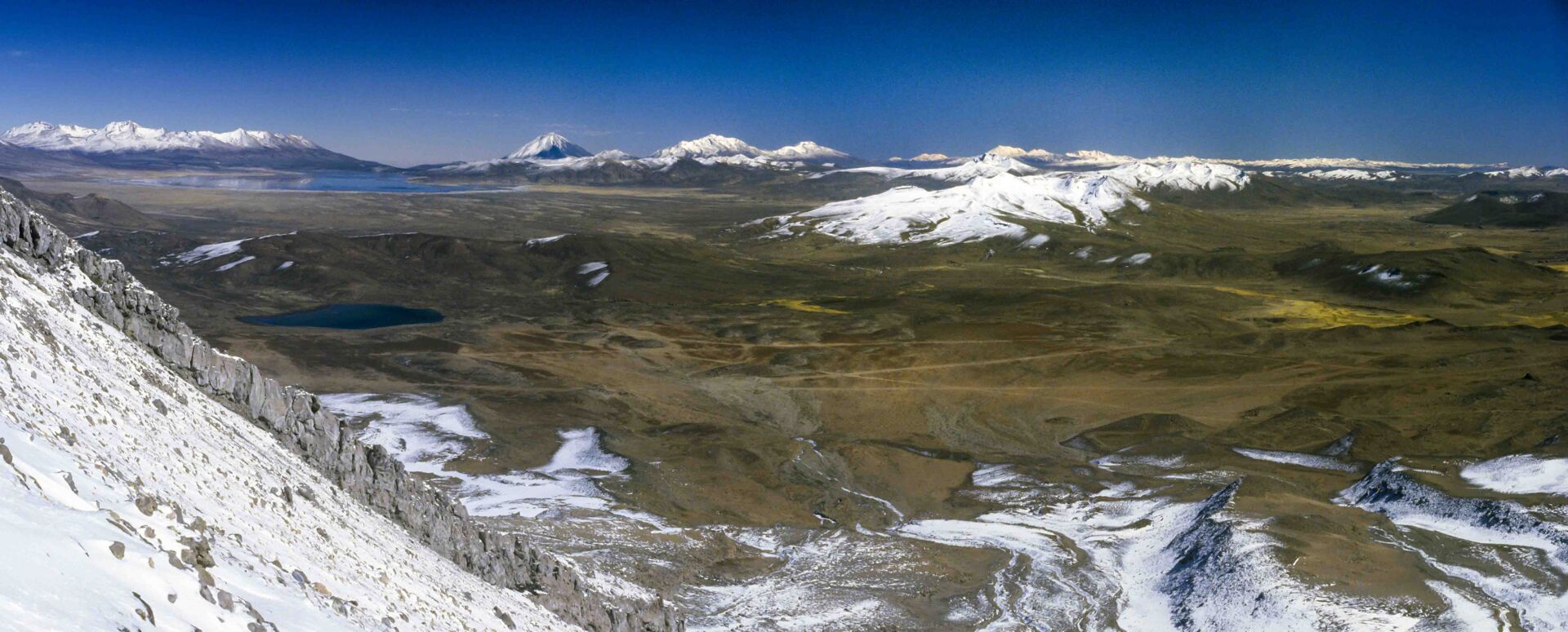 Volcán Ubinas (5672 m). Ruim veertig kilometer van de Ubinas verwijderd spiegelen vulkanen zich in het grote zoutmeer Laguna Salinas Borax. Daarachter ligt de sierlijke vulkaankegel van de Misti (5822 m). Rechts daarvan de Chachani (6075 m).