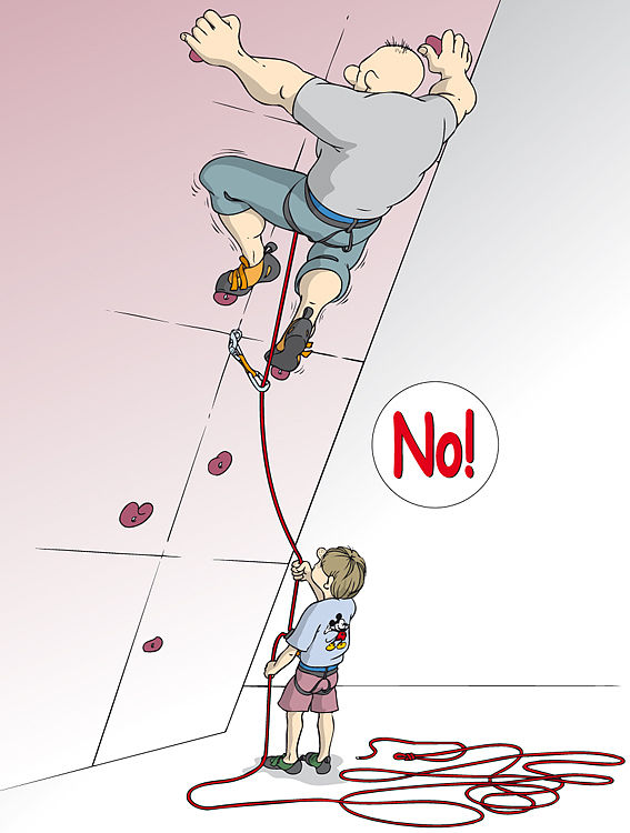 Als je klimmer nog onderin de route is, wees dan extra alert. Wanneer hij of zij laag bij de grond valt, is er een risico op vallen tot op de grond of op omstanders. Niet alleen bij voorklimmen, maar ook bij topropen. Zeker de eerste 5 meter daarom strak en oplettend. Bij het voorklimmen probeer je nog een stapje hoger te komen om je touw in te hangen, zodat je niet overstrekt staat. Omdat je onderin de route tot op de grond kunt vallen, is het slim om je lichaamshouding daarop aan te passen en met gebogen benen te landen.