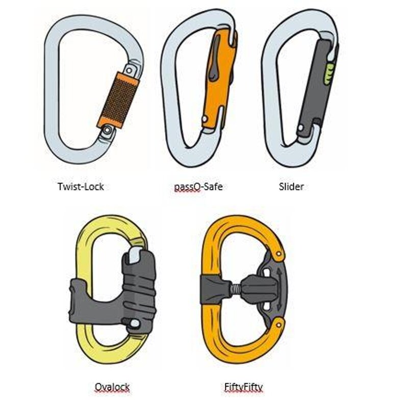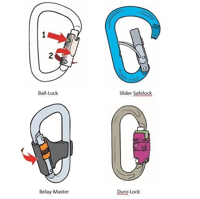 Om te beginnen moeten we kijken naar welke typen beveiligde sluiting er zijn. 'Beveiligde' en 'extra beveiligde karabiners' zijn karabiners waarvan de snapper, in afwijking van normale karabiners, beveiligd is tegen ongewenst open gaan. Dergelijke sluitingen zijn bedoeld om te gebruiken in situaties waar het ongewild open gaan van de karabiner ernstige gevolgen kan hebben.