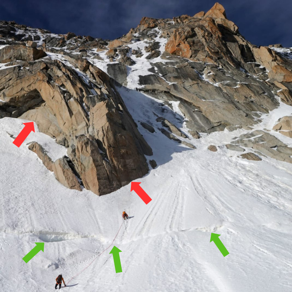 De randspleet (groene pijlen) is voor de klimmers slechts een hobbel. Bij de linker groene pijl zou de oversteek al lastiger worden. Bij de rode pijlen ontstaat vaak de randkloof. foto, Bas Visscher.
