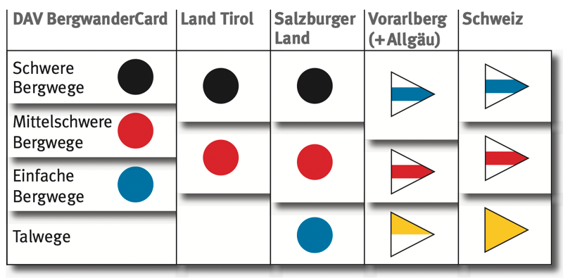 De Duitse en Oostenrijkse Alpenverenigingen proberen al enkele jaren de door hen beheerde bergwandelpaden een uniforme moeilijkheidswaardering te geven. Op de nieuwe wegwijzers worden de bestemmingen voorzien van blauwe, rode en zwarte bolletjes die de moeilijkheid van het traject aangeven (zie afbeelding 2). Een kleurcodering die de meeste mensen al kennen van het skiën op de piste. Het werk gaat echter zeer langzaam want alleen al binnen Oostenrijk hebben de deelstaten Tirol, Salzburg en Vorarlberg afwijkende classificatiesystemen (afbeelding 3). De verwachting is dat het opnieuw markeren van de routes nog jaren kan duren. Het is dus altijd belangrijk dat je goed oplet waar je bent en wat de kleurcode ter plekke betekent.
