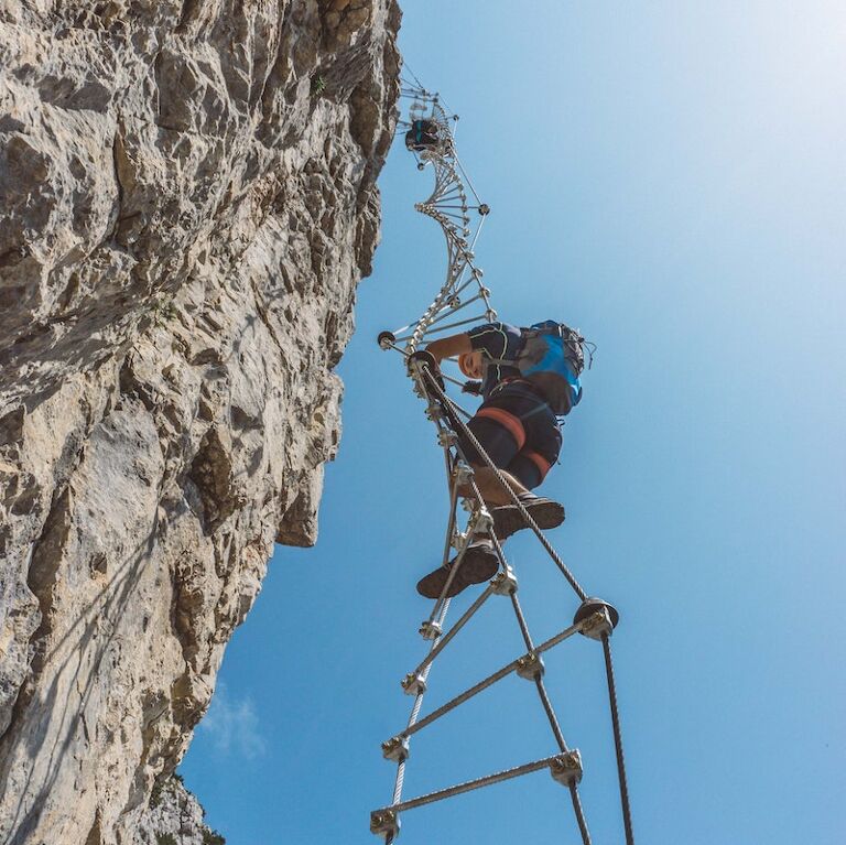 IJzeren kabels, staaldraad en voetsteunen die als nietjes uit de rots steken. Daar waar het wandelpad ophoudt, kun je vaak verder via een klettersteig. Gordel om, helm op, klettersteigset paraat en gaan.
