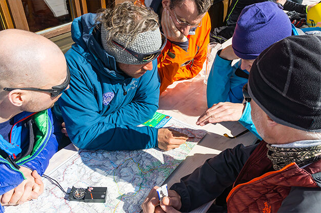 Thuis kun je al beginnen aan je tochtvoorbereiding. Oriënteer je bijvoorbeeld met gidsen, kaarten en de Tochtenwiki, zodat je weet welke toerskiroutes er zijn en waar rustgebieden zijn afgezet voor het wild. Eenmaal ter plekke vul je die kennis aan met informatie van het lokale VVV of het gidsenbureau. Check daar of je geplande route, de paden en hutten in de winter open zijn. Zorg dat je alternatieven en omkeerpunten inplant voor wanneer het weer tijdens de tocht omslaat, de condities toch anders zijn dan verwacht of een van je tochtgenoten het te zwaar heeft.