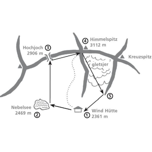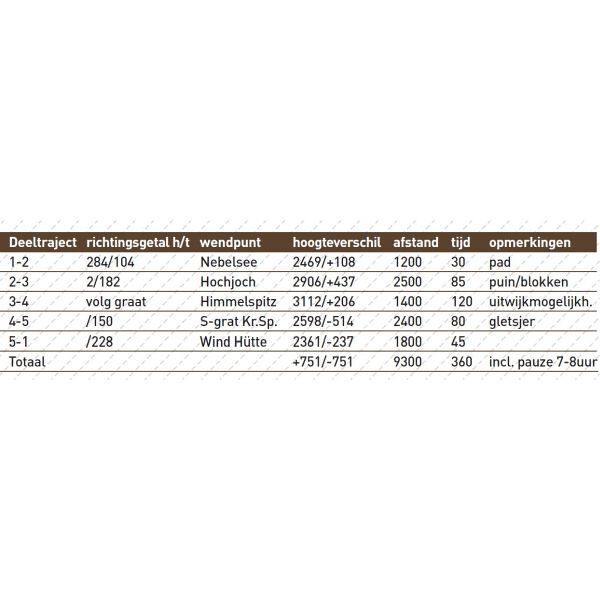 Zoals je in het schema ziet, komt de ingeschatte aanlooptijd op 30 + 85 = 115 minuten en de berekende afdalingstijd op 80 + 45 = 125 minuten. Dat is dus meer dan tijd die in de wandelgids aangegeven stond. Verder is een uitwijkmogelijkheid vanaf de top van de Himmelspitz door de SW-flank (Normalweg, gemarkeerd) genoteerd. Die duurt 2 uur. Let op: in het routeschema is voor de beklimming van de graat een ruime marge opgenomen (120 i.p.v. 60 minuten) vanwege de onervarenheid van de klimmers en de groepsgrootte. Hiermee komt de ingeschatte totaaltijd van de tocht op 6 uur, met pauze(s) 7 tot 8 uur. De wandelaars weten dat als ze om 6 uur opstaan en om 7 uur vertrekken, ze om ca. 15 uur terug zijn.