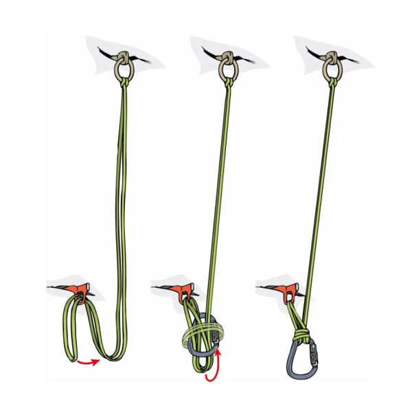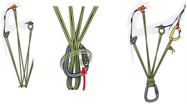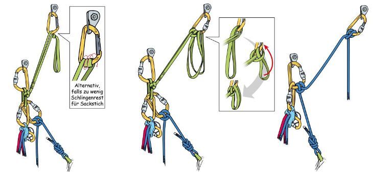 Standplaatsbouw met hulptouwtje, 4 punten en ankersteek. Afbeelding: Bergundsteigen.com