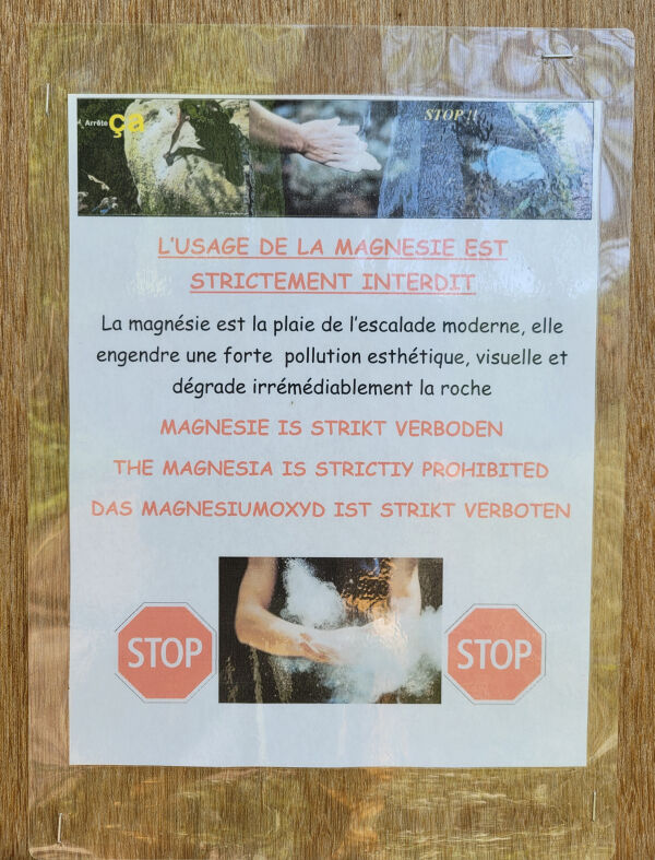 Het belangrijkste tegenargument wat betreft het gebruik van magnesium op de rots is dat passanten of grondbezitters de witte vlekken op de rots vaak lelijk vinden. En dat is op zich een heel legitiem punt. Mensen kunnen zich door magnesiumvlekken op de rots in hun natuurbeleving gestoord voelen. Of ze hebben de indruk dat klimmers een soort graffiti hebben achtergelaten. Terecht? Ja, want een gevoelskwestie. Maar in het perspectief van de impact die het wandelpad en de parkeer-infrastructuur heeft op de natuur (natuur of aangeplante bos?) zijn de paar witte vlekken op de rots natuurlijk verwaarloosbaar. Gevoelens zijn echter moeilijk kwantificeerbaar en de hardste roeper heeft al snel gelijk. In veel gebieden, met name in Duitsland, is het gebruik van magnesium daarom verboden, of wordt het - mits met mate gebruikt - op z'n hoogst getolereerd.