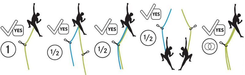 | Multi-pitch rotsklimmen | dubbeltouw (halftouw of twintouw) | 50 à 60 meter | 7,1 à 8,5 mm | ja |