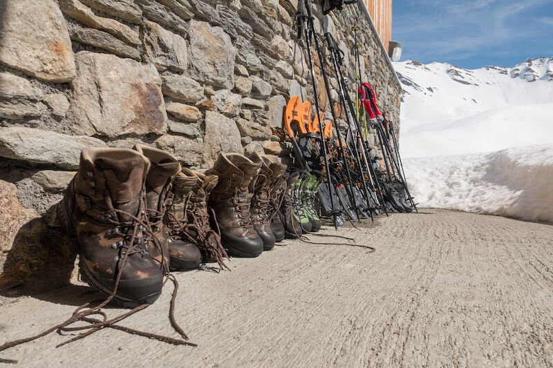 Kleed je niet te warm. Dat is meestal niet nodig, omdat je actief bezig bent. Het beste is om verschillende lagen aan te trekken, dan ben je flexibel onderweg. De bergbroek die je in de zomer aantrekt, kun je in de winter ook aan. Eventueel met een extra thermobroek eronder. Op je lijf is een thermoshirt ook fijn. Daarop een laag die de wind tegenhoudt, een softshell bijvoorbeeld. Natuurlijk heb je altijd een hardshell bij je, maar tijdens het lopen heb je het daar snel warm in. In je rugzak heb je een extra laag voor de warmte, bijvoorbeeld een donsjas. De uiteinden van je lijf krijgen het snel koud. Een muts en een paar handschoenen en een zonnebril zijn ook altijd mee. Voor je handen is het ook fijn om met laagjes te werken. Een dunner en dikker paar handschoenen zorgt voor flexibiliteit in temperatuur. In de winter kun je flink verbranden, dus zonnebrand en lippenbalsem smeer je ruimschoots in.