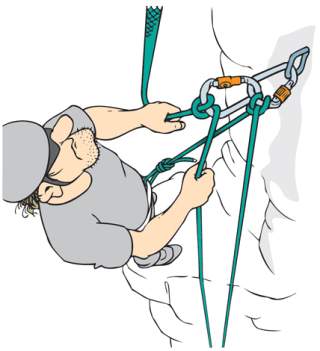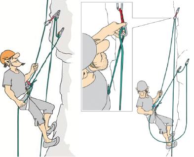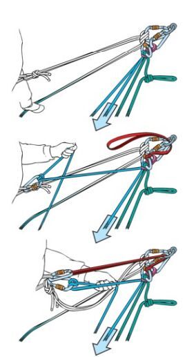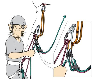 Een generieke methode voor het veilig deblokkeren en laten zakken van een naklimmer met een tuber in guide-mode. De naklimmer aan het blauwe touw heeft touw nodig. De naklimmer aan het groene touw niet. De blokkering van het zekeringsapparaat (de afbeelding laat een oud type plate zien) wordt opgeheven door de karabiner met een bandlus naar boven te trekken. In het groene touw ligt een knoop - de naklimmer aan groen is hierdoor beveiligd tegen naar beneden vallen. De naklimmer aan blauw wordt (over het lichaam met een HMS) gezekerd naar beneden gelaten.