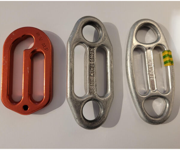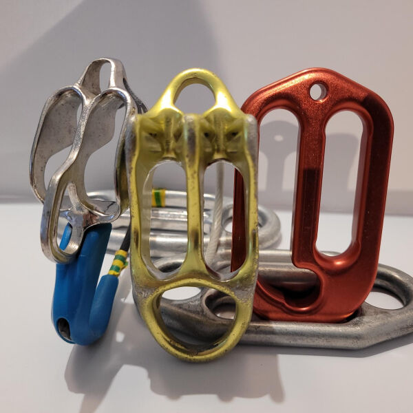 Foto boven: de sleuven waar het touw in de nazeker-stand door heen gaan zijn bij plates (hier de New Alp Magic Plate (rood) als voorbeeld) een flink langer dan bij een tuber (Edelrid Microjul en Petzl Reverso). Er is daardoor meer ruimte voor het touw om soepel door de plaat en om de karabiner heen te gaan. Touw inhalen gaat daardoor een stuk soepeler, vooral met enkeltouw of natte/verijste touwen. Iets wat in lange routes wanneer je vermoeid begint te raken een merkbaar verschil is.