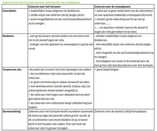 En dan nu het hete hangijzer, het zekeren van de voorklimmer. Moet dat over de stand of over het lichaam? Om gelijk met de deur in huis te vallen, het zekeren over de stand is een prima methode waar qua veiligheid geen vraagtekens bij gesteld hoeven te worden. Het is voor een heel breed spectrum aan situaties en onafhankelijk van de ervaring van de zekeraar het eerste keus scenario. Zekeren van de voorklimmer over het lichaam is echter niet fout of inherent onveilig. Het vraagt echter wel om extra randvoorwaarden, waaronder een ervaren zekeraar en een veilige setting om een eventuele val op te vangen.