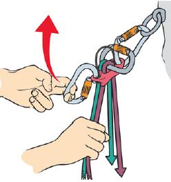 Een generieke maar gevaarlijke methode om een tuber in guide-mode te deblokkeren. Het deblokkeren is heel binair (aan/uit). Zeker wanneer de naklimmer relatief zwaar is of wanneer de zekeraar niet al te sterk (of al moe) is. Bij het opheffen van de blokkering van de naklimmer(s) bestaat gevaar dat deze ongeremd de volledige lengte van het touw naar beneden valt! Veel veiliger is de methode in afbeelding 2 .